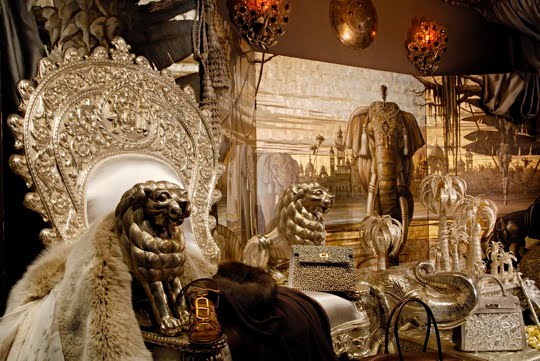 Kazda z witryn wprowadza w inny niesamowity swiat. Czasami jest to swiat polowan i podrozy - kon orientalny, czasami dziki, barwny jak swiat Afryki, innym razem pelen elegancji, bogaty w ornamenty, biel kosci sloniowej swiat Indii, pelen mozaik i tutaj trzeba zwrocic uwage na nietuzinkowe torebki, ktorych dekoracja byly wlasnie mozaiki. Nie wiem, czy sama zdecydowalabym sie na tak oryginalny zakup... Zdecydowanie bardziej odnajdywalam sie w inspiracjach indyjskich, gdzie znalazlam boska kremowa torebke, z ktora z checia z tej wystawy bym wyszla:D.